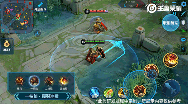 【一技能:爆裂冲撞】一技能廉颇向指定方向发起冲锋,对敌人造成伤害并将其击飞。