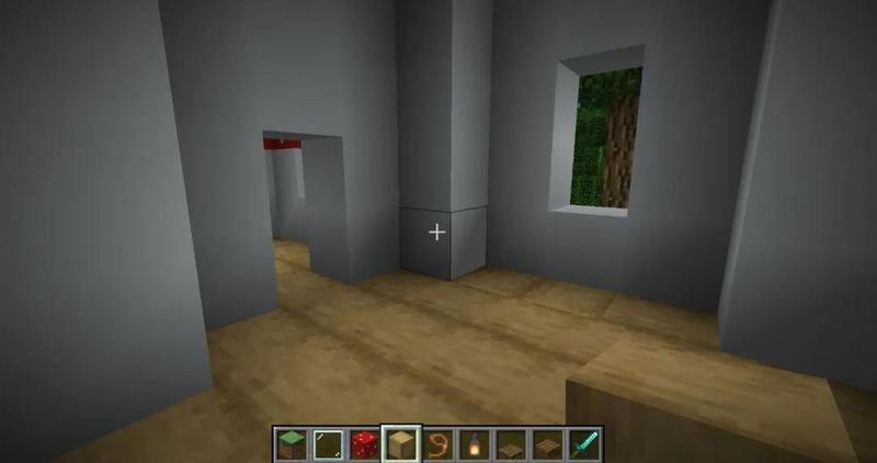 大房间通向小房间的墙面开个门,然后小房间三侧的空隙都补一个蘑菇方块。