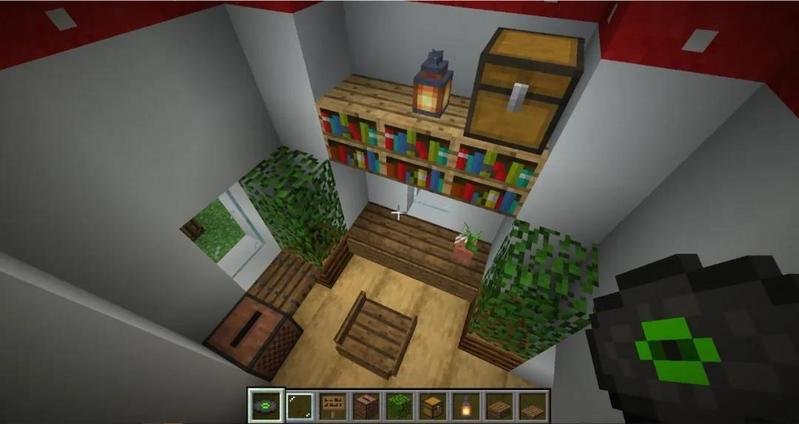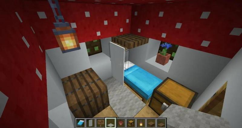 白色混凝土/白桦木(作为蘑菇根),红色蘑菇块(屋顶),去皮橡木/其他木质材料(地板)