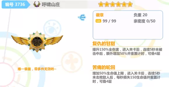 复仇的甘甜:提升150%全伤害;进入关卡后,连续5秒未被击中后,额外增加50%并重置计时,可叠4层