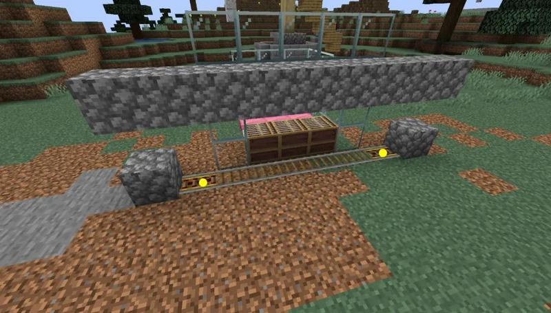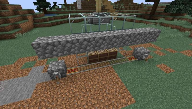 玻璃、床、箱子、漏斗、铁轨、充能铁轨、拉杆、圆石、石砖墙、命名牌、织布机、台阶、岩浆、岩浆、水、告示牌。
