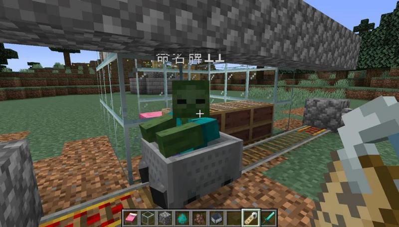 接着轨道上放置一个矿车,再抓一只僵尸进来,并且给它命名防止它被刷掉。以后它就是工具尸了。