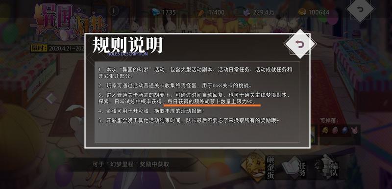 本次活动专用的体力,与普通体力分开计算,会随时间自然回复,可以通过探索、扫荡梦境关卡等方式额外获得,每日最多可额外获得90萝卜(注意别吃面包上头了)