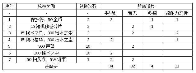 被特训后会获得:手里剑、苦无、铃铛、超耐力忍传不同的道具,再兑换对应的奖励即可,这个活动只要按时参加是都可以兑换完的,接下来我们看看一共需要多少道具,也是按照本人推荐的兑换顺序来列吧。