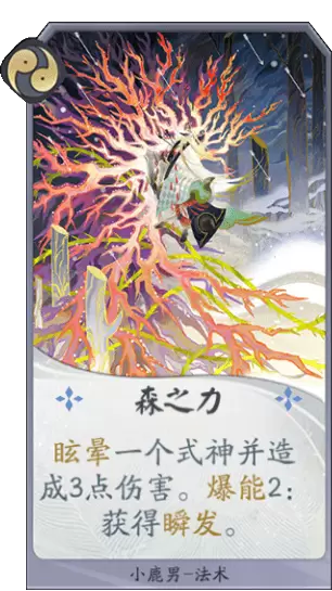 森之力:主要用于后手阶段控制对方的关键式神,拖延对方卡组的节奏,优先3勾展开,可带满,不带生生不息。为了提高卡组上限,我带了一张生生不息。