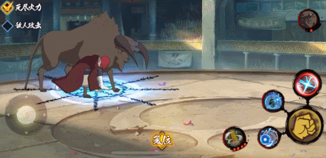当然,实战中对手并不会原地发呆,但即使未攻击到敌人,也可以逼迫对手走位。使用一些技能强势的忍者时,可以在召唤公牛后,与其一起向前移动,从而压制对手走位,抢占先机。