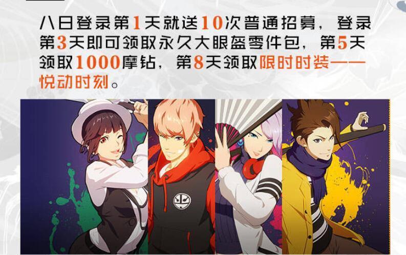 首日登录送10次普通招募,登录第3天即可领取永久大眼盔零件包,第5天领取1000摩钻。第8天领取限时时装-悦动时刻。