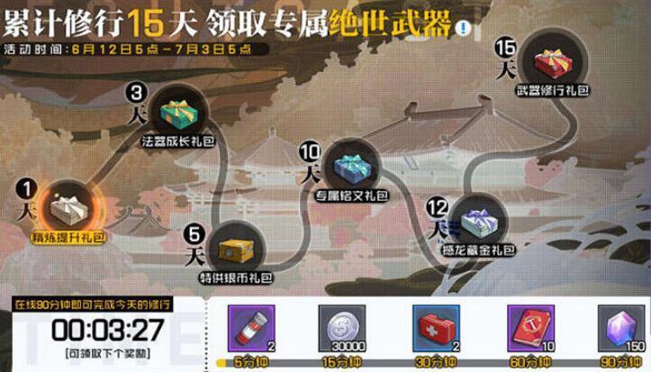 累计修行达到指定天数更可以获得珍稀铭文、撼龙藏金礼包、绝世武器等稀有奖励。