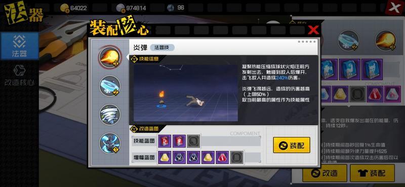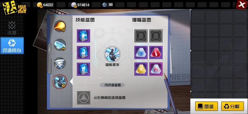 3、法器需要升级,可以获得大量属性,外壳也可以增加属性(类似于皮肤 ),一共6个,3个任务给,一个累签3天给,飞机20块礼包里获得,企鹅是通行证60级获得。法器一共4个附加技能,但是只能带3个,伤害也算可以,潜能激发增加20伤害必带,还有一个法器改造,每个技能可以打6个增幅蓝图和3个技能蓝图,就是类似于提供buff,提高你一段时间伤害,但是每个技能一个图只能用一次。