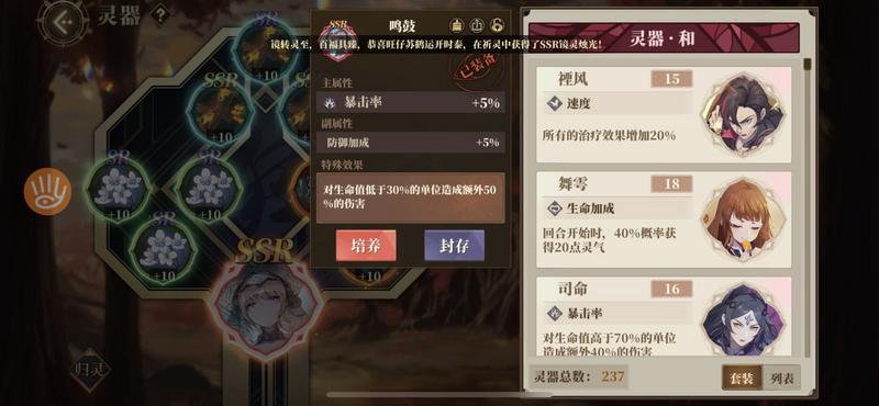 灵器的选择推荐锁云+司命,开局30火,雷狮只能提供24%加成,司命可以提供40%加成,锁云则是保证输出的稳定性。但使用司命会造成后期输出的疲软。