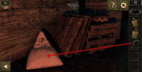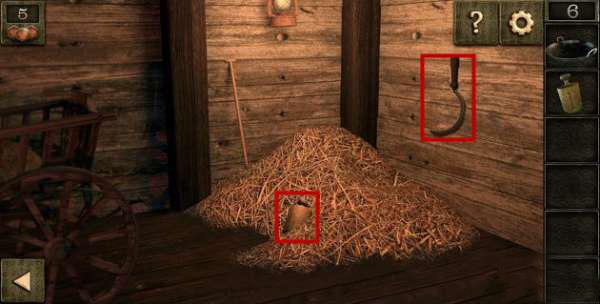3、到右上方草堆,捡起另一个砝码,取下墙上的镰刀。