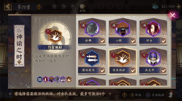 BOSS关卡选御魂下,只要勾玉充足,这次爬塔值得一刷。侦查力全卖完需要9000勾玉差不多。