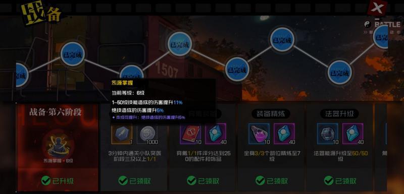 在完成每一大阶段战备时,就会解锁对应等级的被动技能【炁源掌握】,以战备第六阶段为例,【炁源掌握】就能提升1~50级技能11%的伤害,提升绝技5%的伤害。这提升是非常明显的,战备等级越高,被动技能提升效果越明显!