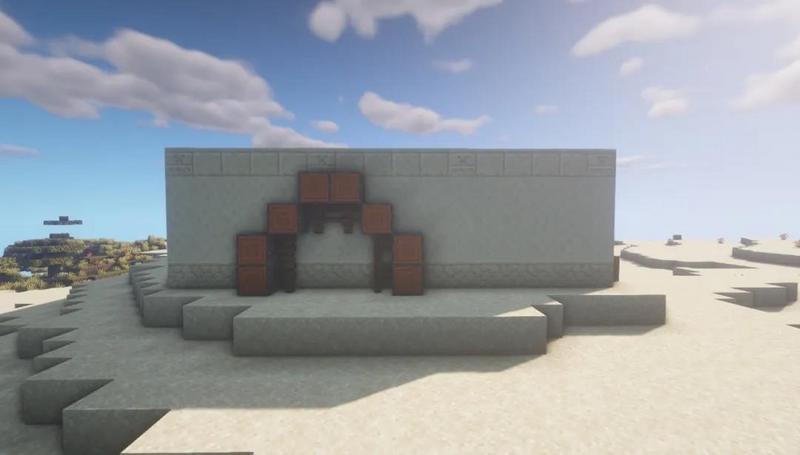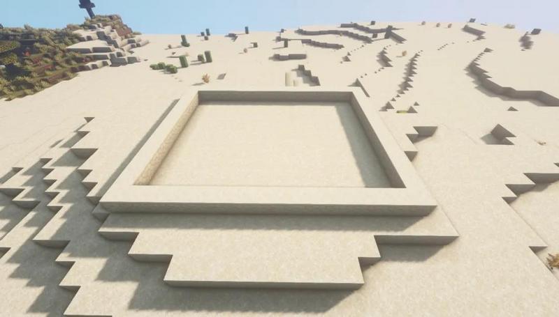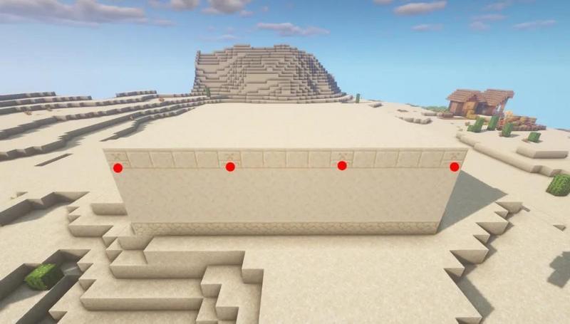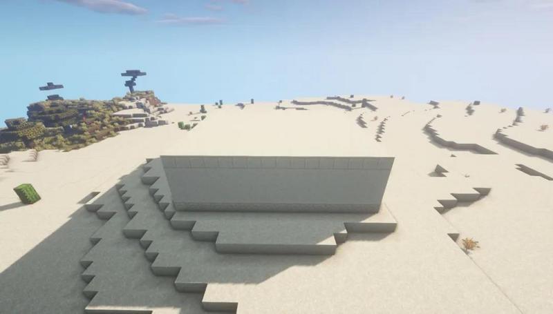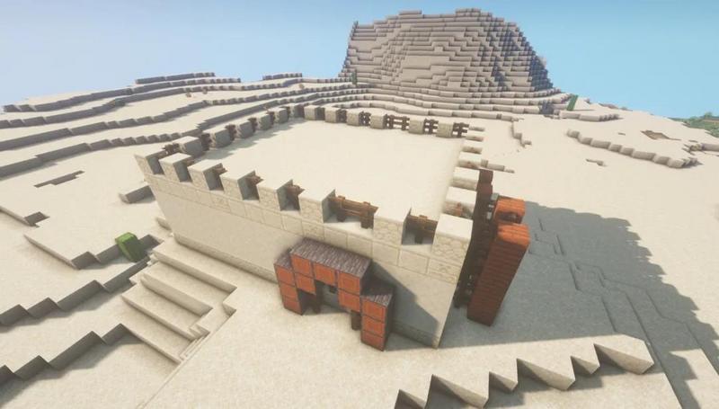 首先在沙漠中找到一块有地形起伏的高地,然后在上面用砂岩围出一圈16×13的方形地基。