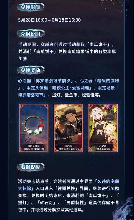 玩家在活动中赢取的「南瓜饼干」可以在南瓜糖果铺中兑换各类丰厚奖励,包含两张限定心之器、爱蜜莉雅限定头像框和限定场景等各种丰厚奖励!