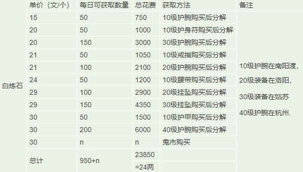 该表以30文/个为标准进行数据统计,且统计数量为每日可获取的数量, 获取方法中,并没有忽略武器购买后分解这种方法,只是其最后计算价格大于标准单价30文/个(已排除包扩铁匠铺所购买的白炼石50文/个的价格),故不予展示。