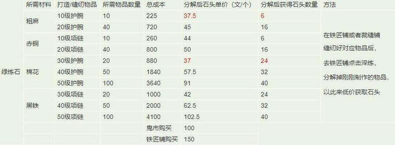 绿蓝炼石一般采用缝纫/打造护腕或者项链来获取,至于为什么选择护腕和项链,因为其打造成本较之于其他部位成本较低,且该表优先以材料进行分类,玩家可根据自身材料数量,有选择的进行制作,但绿蓝炼石因为具有随机性,所以在查看此表时,不可太过于片面看到物品价格。