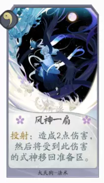 大天狗快攻是一套存在已久的牌组,固定搭配妖刀姬与雪童子这两个式神。核心思路是靠大天狗的风神一扇过墙,从而让打脸收益极高的妖刀姬以及有霜风晕脸的雪童子能够直接打到对手脸上。配合大天狗的被动,每两回合就会有一个风神一扇让对手头疼。