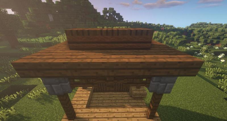 用云杉木台阶搭建顶部,中间三格将云杉木台阶替换成堆肥箱,用云杉木活板门盖住堆肥箱。