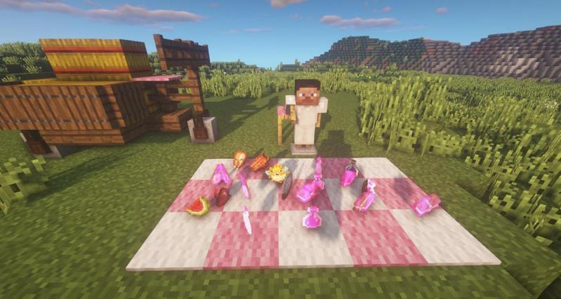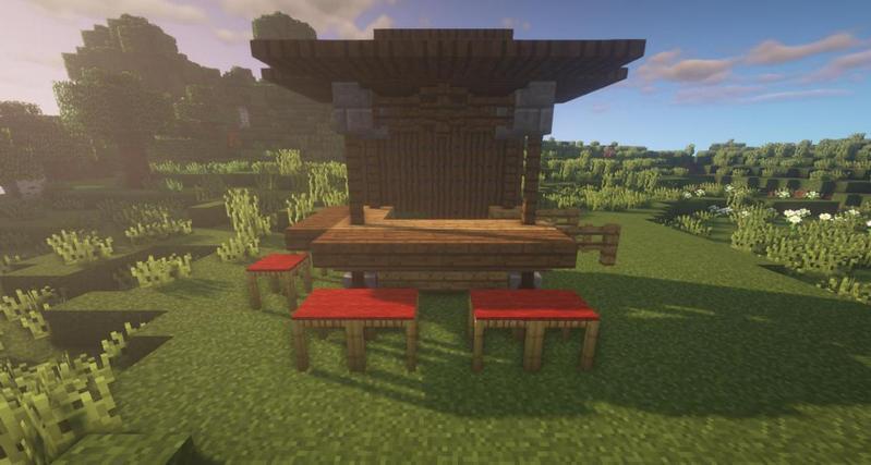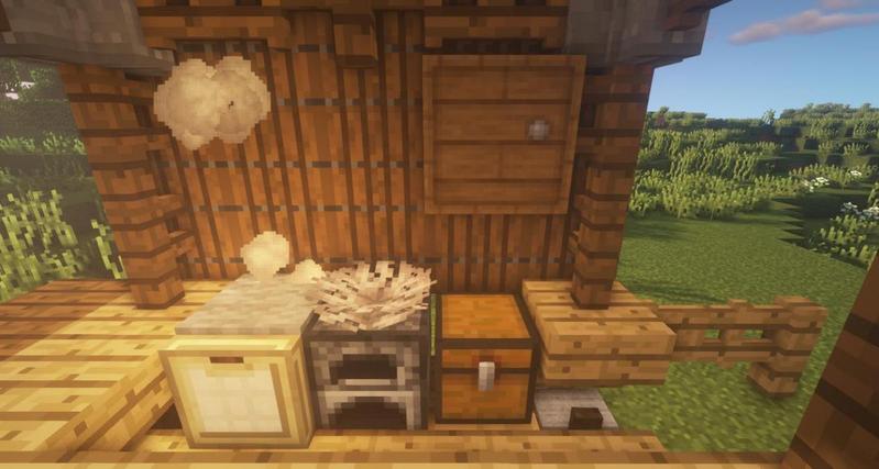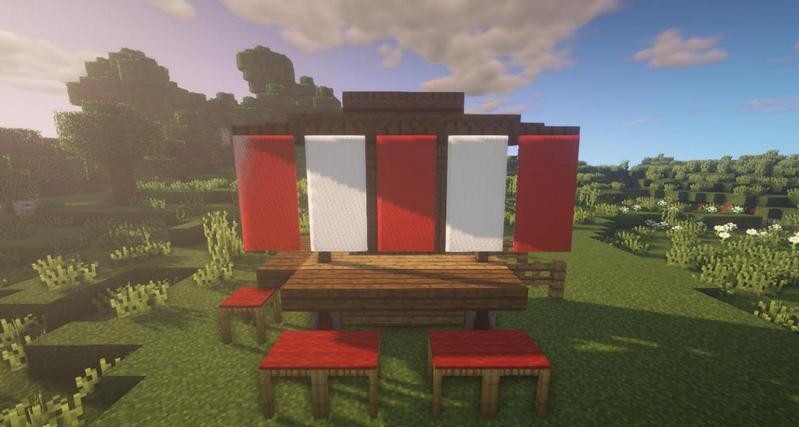 橡木台阶、橡木楼梯、橡木栅栏、橡木栅栏门、云杉木栅栏、云杉木活板门、石云杉木台阶、砖墙、脚手架、红色羊毛地毯、灰色羊毛地毯、旗帜、营火、失活的鹿角珊瑚扇、箱子。
