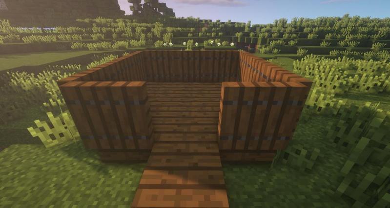 四角放上石砖墙,用云杉木栅栏和云杉木活板门连接。