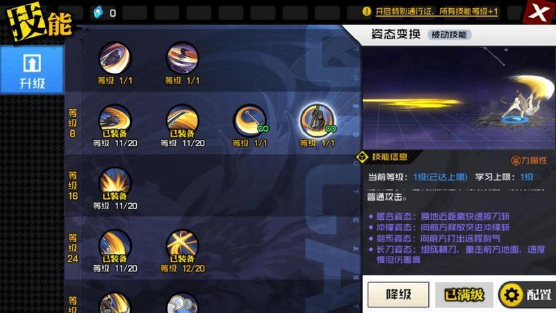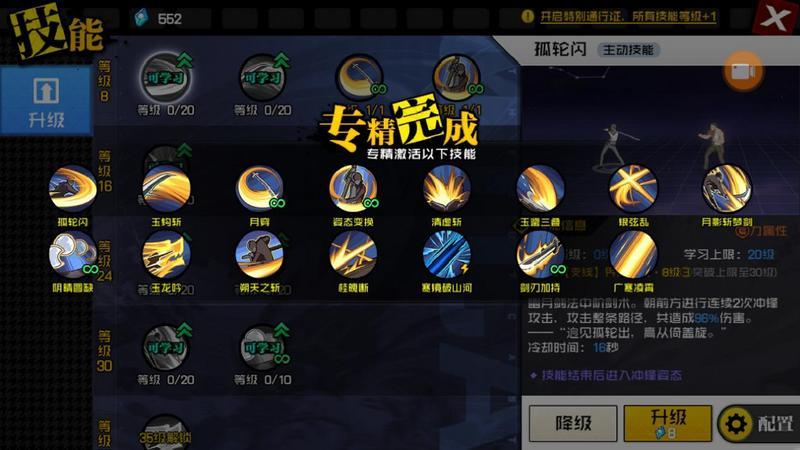 幽月剑在技能使用完后,会使自己进入不同的姿态(共4种),在这些姿态下点击普通攻击按钮,会进行一次特定的姿态攻击,命中敌人后会让自己进入一个短时间的强化攻击状态。