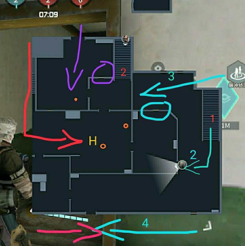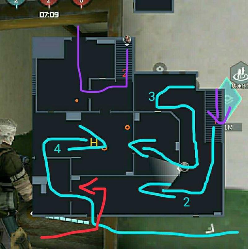 而选择二号楼梯由低打高比较危险,且占据楼梯平层后,会遭遇来自点位房间的正面攻击,和来自中路方向的紫色方通过小窗的后方攻击,这个点位在对方大都齐装满员时不做推荐。