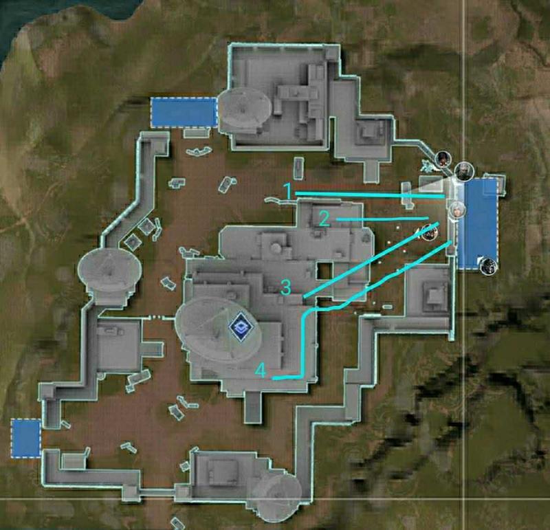 1、以上所有标为蓝色的区域都是出发点。一共有三个。雷达站作为三方对战的新地图,游玩体验与双方对战还是有很大差别的,而且战场更加混乱且富有挑战性。也可以看到点位所在的建筑相较于别墅和酒吧更加复杂,室内战斗会变得更加激烈。室外因素的影响相对会降到更低——因为各方都明白,切实的占住点,不让第三阵营趁我们和第二阵营鹬蚌相争时渔翁得利,这点变得更加重要。为了方便称呼,在后文中将右侧阵营称为蓝色方,中间阵营称为紫色方,而左侧阵营称为红色方。