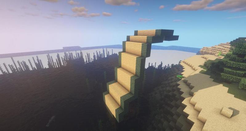 尾巴末端是这个样子,要用到暗海晶石楼梯、暗海晶石台阶和海晶石砖楼梯。
