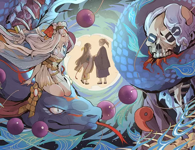 清姬敛起周身萦绕的杀气,青蛇盘成几圈,托着她缓缓落在地面。她向厉魔伸出了纤白的手,一步一顿地优雅上前。