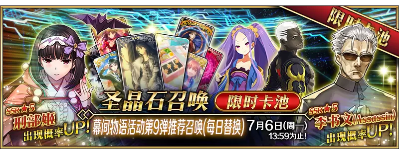 「幕间物语活动第9弹」的关联从者「★5(SSR)刑部姬」、「★5(SSR)李书文(Assassin)」将以每日替换的形式参与推荐召唤,「★4(SR)卫宫〔Alter〕」、「★4(SR)不夜城的Assassin(武则天)」将一直被推荐召唤!