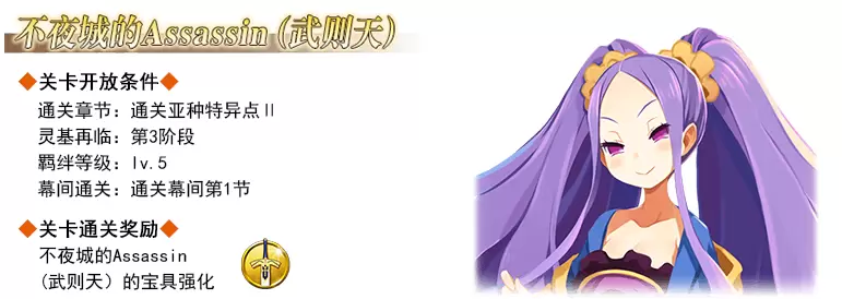 新效果:对敌方单体发动1600%~2400%的攻击,敌方单体强化状态解除,付与毒状态1000(3回合),自身暴击威力提升50%~100%(3回合)