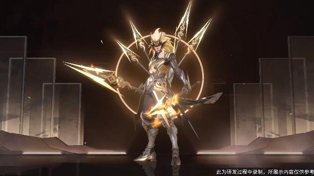 【服饰元素设计】极具视觉冲击力的金色长发、金狮盔,搭银黄铠甲矫健似猛兽,以直角排列和闪电纹样表现极速突进的张力。