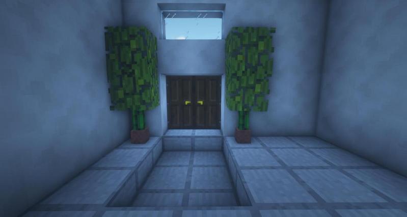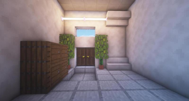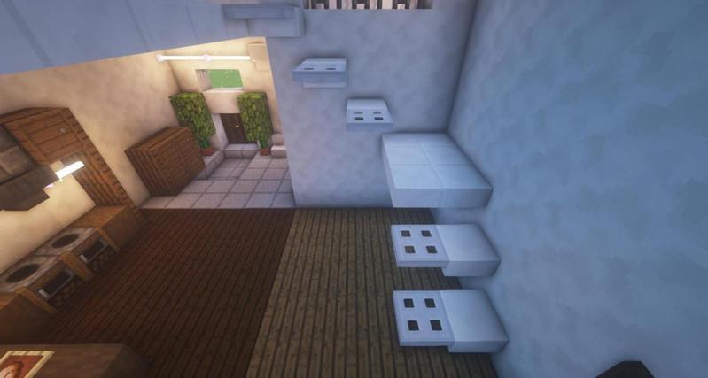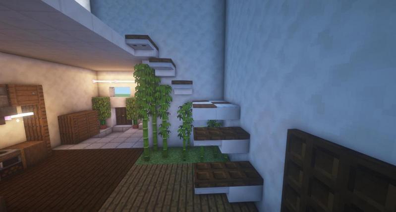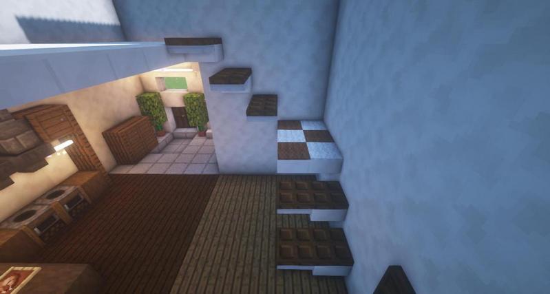 用石英台阶和铁活板门搭出楼梯大致样子,然后用深色橡木活板门和羊毛地毯作为装饰。