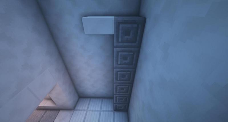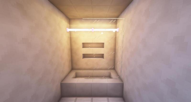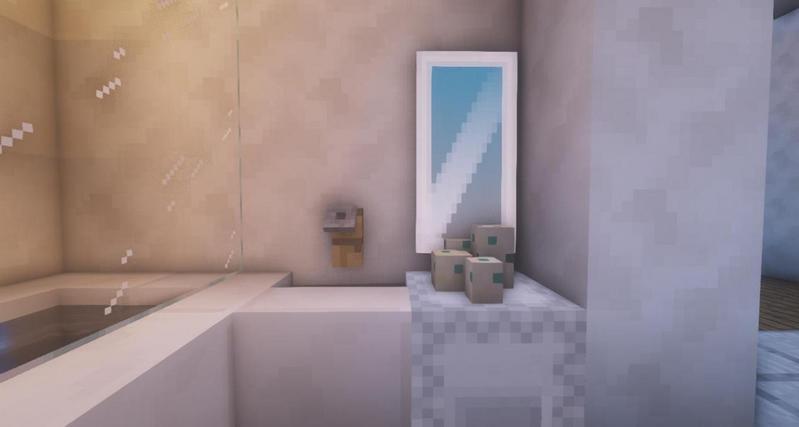 放上石英楼梯和潜影盒,石英楼梯上放上绊线钩作为水龙头,潜影盒上放镜子旗帜,再放上海龟蛋作为沐浴露等瓶瓶罐罐。