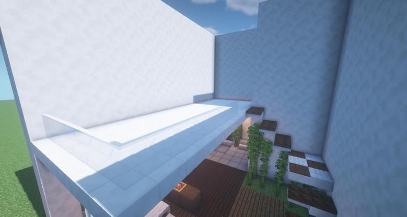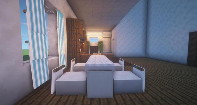铁活板门上放上白色羊毛地毯作为桌面,淡灰色旗帜作为桌腿,用石英台阶和白色旗帜做椅子。