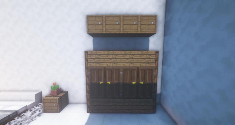 用云杉木板、深色橡木活板门和深色橡木门做一个柜子,上面放一排木桶增加储物空间。