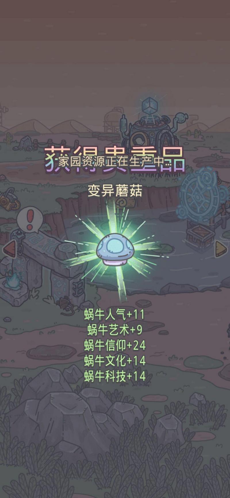 第二场景中在蘑菇生产的中心位置会有一个格格不入的蓝色光环在土里猫着,玩家需要手动点击几次后这个蓝蘑菇就会被我们的时光机一道闪电劈成炭烤蓝蘑菇,这时候再次点击玩家就会获得绿色(锅中品)——《变异蘑菇》。