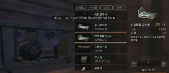 时尚温馨双人床,能恢复50点武器和防具的耐久,就是双人床单人睡有点寂寞啊。双人床配方来源:配方研究台的兑换中心,3w新币加30个配方研究数据可以买。