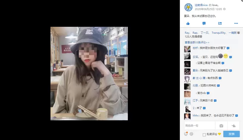 此外根据“死者档案”公布E-mail(1127200742@?),我们可以找到死者的QQ号并进入QQ空间,找到唯一一张照片并通过分手时间(三年前的演唱会20170715)解锁死者前女友档案,了解她的名字叫“夏朵”,并通过死者微信号“zzhaixd”从侧面印证。