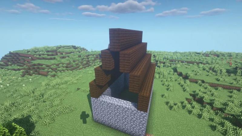 接着在建筑第四格高的位置放置倒放的楼梯,完成建筑的主体装饰。