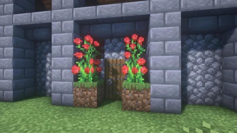 在正面的墙上开个洞,装上门,旁边放置上木栅栏,在两旁也放置草方块,再种上玫瑰丛。