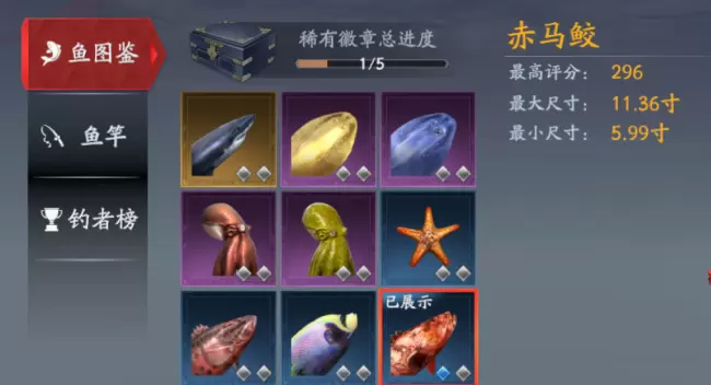激活任一稀有徽章后,即可将该种鱼挂在鱼竿上,挂在鱼竿上的鱼可以再宝船场景中进行展示。