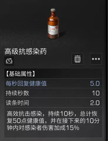 高级抗感染药使用后可快速回复健康值,并在10分钟内对感染者的伤害加成15%。