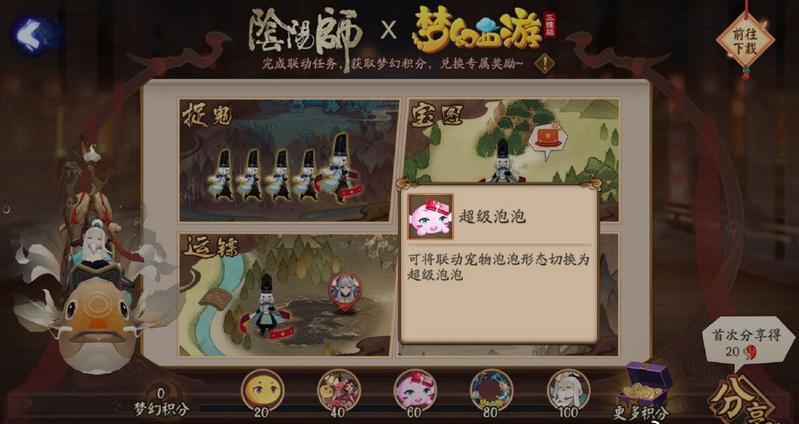 阴阳师大人可以在阴阳师内通过联动玩法,包括「捉鬼」、「宝图」、「运镖」和「封妖」来获取梦幻积分,大人也可以在绑定阴阳师角色与梦幻西游三维版角色后,完成联动任务并获得梦幻积分。使用勾玉或魂玉也可以直接购买积分。不过以上两种途径可获得的积分已远超过获得全部奖励所需积分,阴阳师大人先不用急着购买哦。