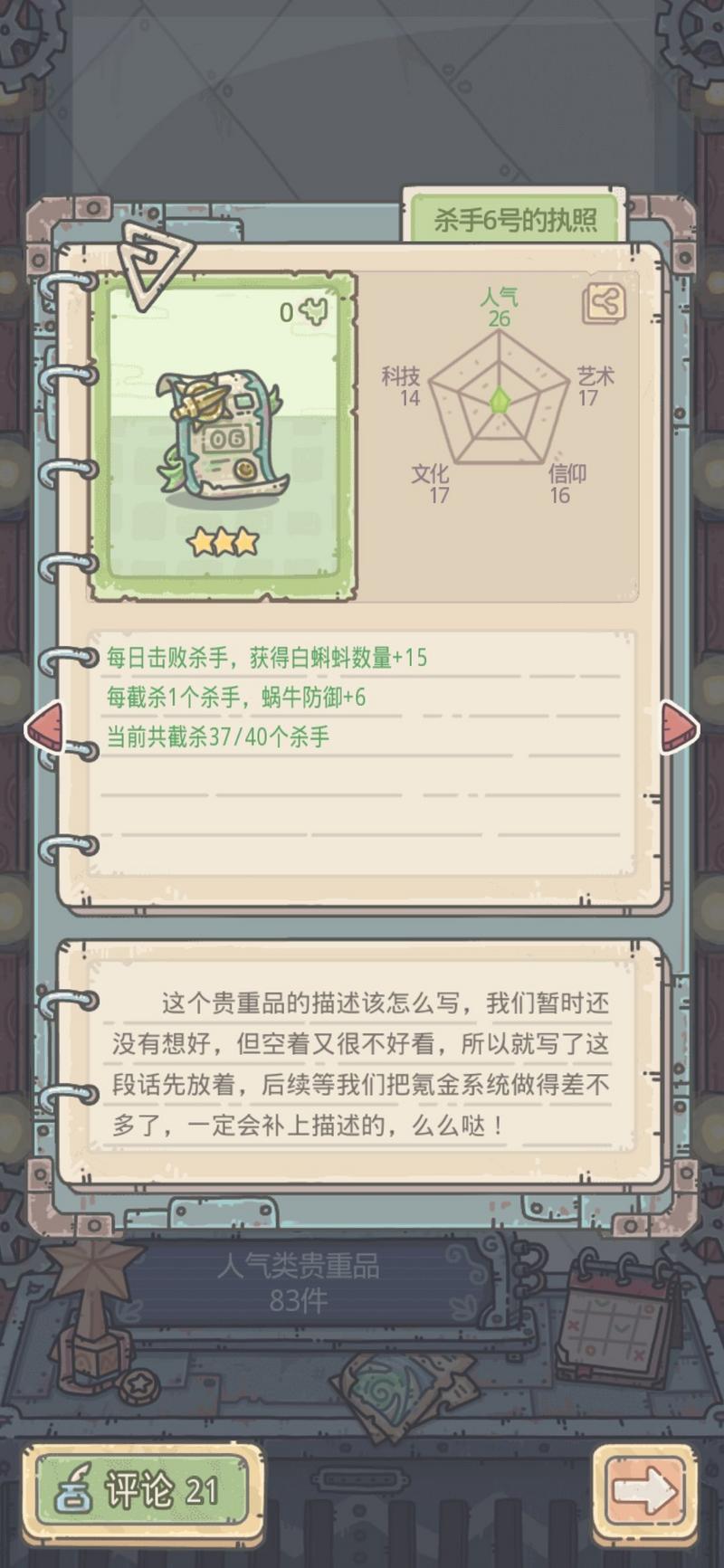 效果:每日击败杀手,获得白蝌蚪数量+15。每截杀一个杀手,蜗牛防御+6、0/40