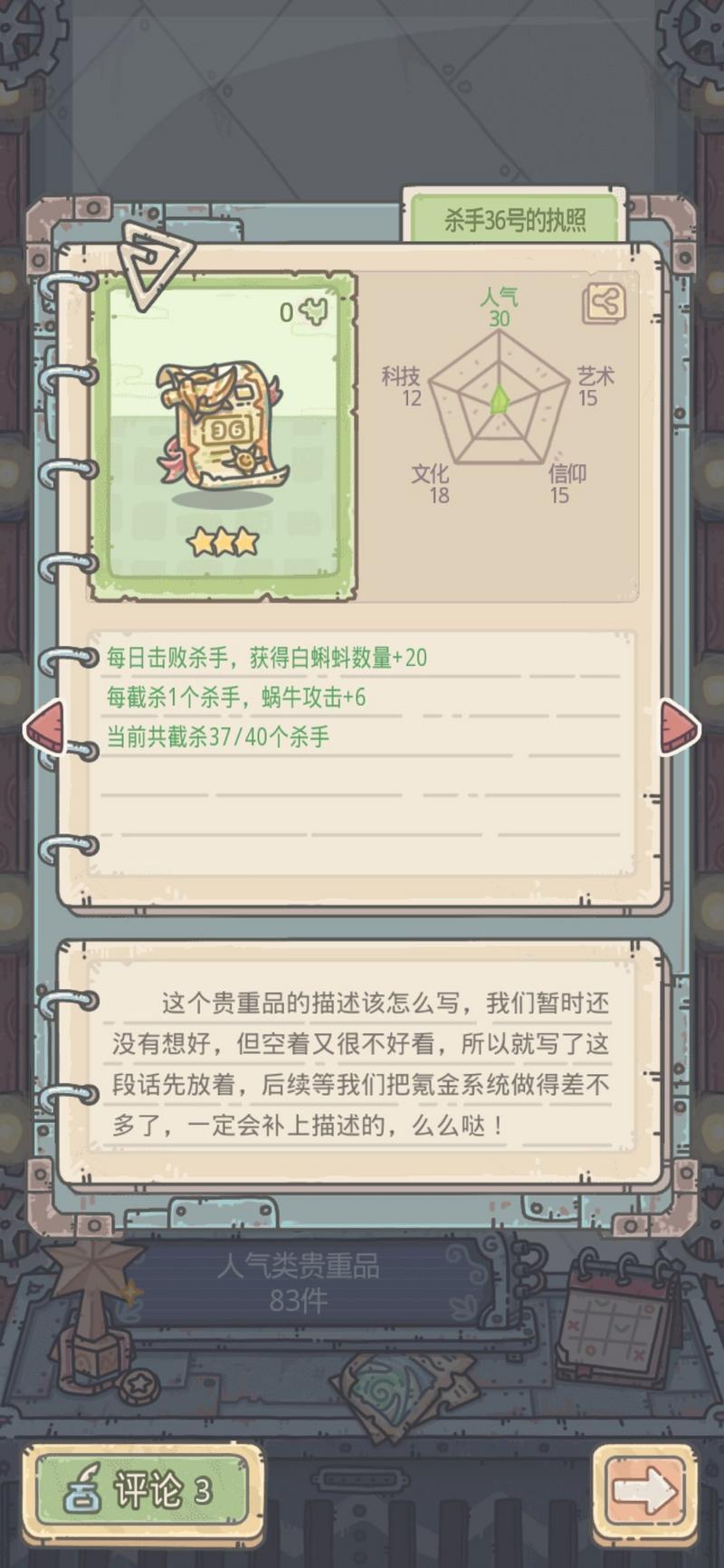 效果:每日击败杀手,获得白蝌蚪数量+15。每截杀一个杀手,蜗牛攻击+6、0/40