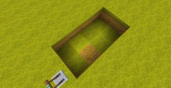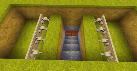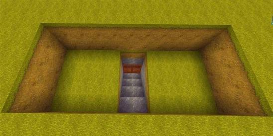 首先在地面挖一个长10格,宽4格,深2格的坑,并在坑中向下挖出楼梯,在地下挖出小密室(楼梯长度和密室大小看需要)。
