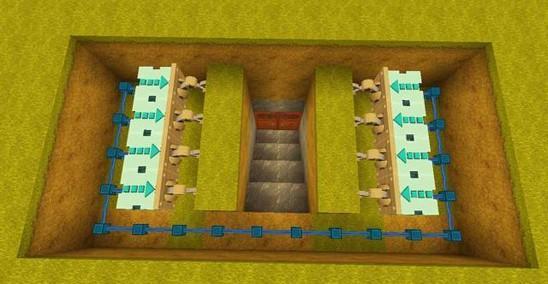 用土块将电能线等电路覆盖,只留楼梯部分,在电能线上的土块上放开关并打开,推拉机械臂将楼梯挡住,地面呈现2×4的凹槽。