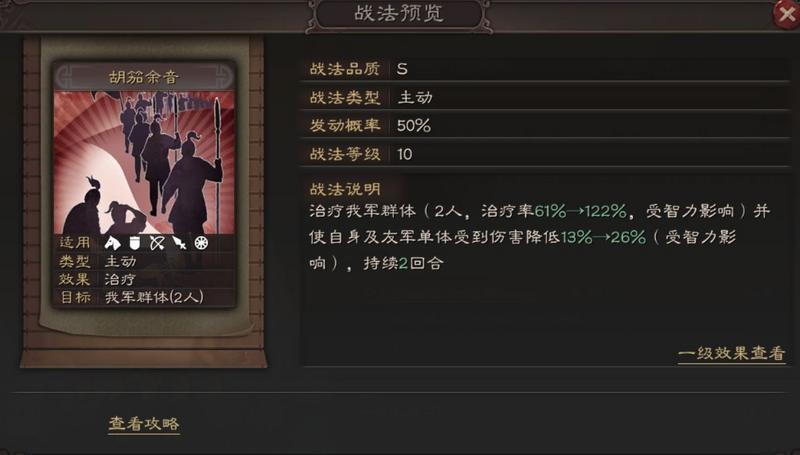 战法分析:50%的发动几率保证其治疗及减伤的稳定性,配合御敌屏障与暂避其锋等减伤战法,可以使队伍的最大叠加减伤达到90%以上,接近无伤。在保证前几回合战损极少的情况下,稳定输出对手,使敌人后继无力从而克敌制胜。